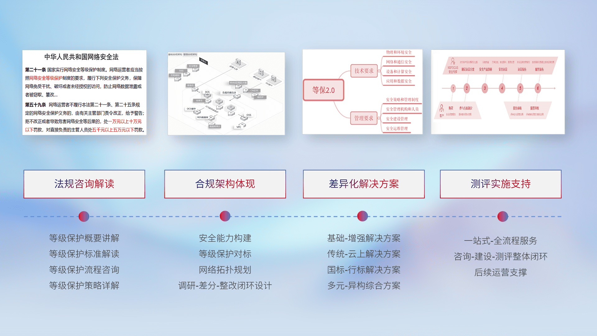 通过专业的法律咨询解读、、、合规架构体现、、差异化解决方案、、、测试实施支持等服务,,,,为客户量身打造等保合规体系。。。